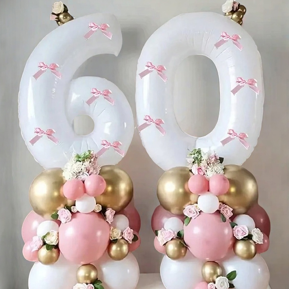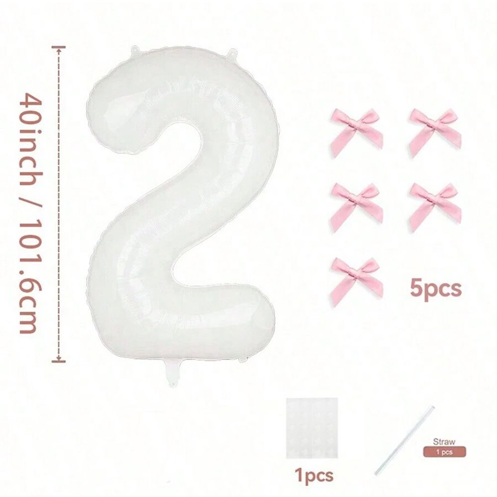 40inch Pink Bow Decor White Number Balloons, 0-9 White Number Balloons With Pink Bow Decor, Suitable For Birthday Party, Anniver